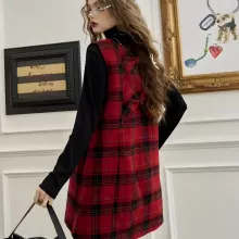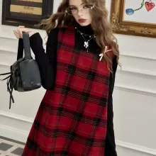This red plaid dress brings a preppy, youthful vibe to your winter wardrobe, perfect for layering with turtlenecks, blouses, or cardigans. Its A-line silhouette and square neckline offer a tailored, elegant fit that is universally flattering. The red plaid pattern is bold yet classic, making this piece a standout addition to any outfit. Whether styled with tights and boots or worn with loafers for a school-inspired look, this dress effortlessly transitions between occasions.