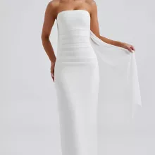 - Design: Strapless and off-shoulder style with sheer mesh sleeves for added allure.