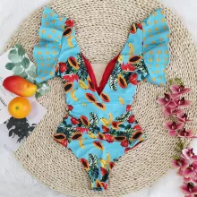 Make your next beach day unforgettable with this sexy and sophisticated one-piece swimsuit. Designed with a deep V-neckline and delicate lace print, this swimwear blends elegance with allure, giving you the confidence to shine whether you’re lounging poolside or diving into the waves. The ruffled edges add a playful, feminine touch, while the padded bust ensures a flattering fit and extra support.