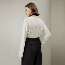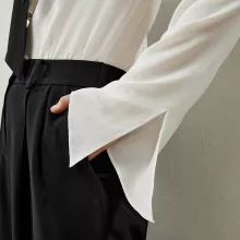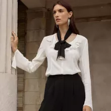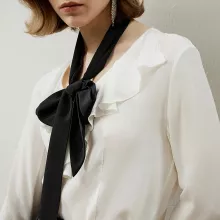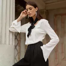 Our Silk Blouse is a marvel of design, offering versatility, style, and comfort. The highlight of this blouse is its 2-in-1 feature with a removable tie, allowing you to style it in multiple ways to suit any occasion. The graceful ruffle bowneck adds a touch of sophistication, while the trumpet sleeves with side slits provide a modern twist on classic elegance. Whether you’re attending a casual meet-up or a formal event, this blouse is your go-to choice for making a statement.