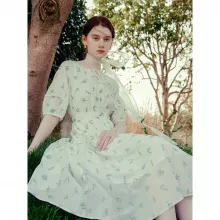 What sets this dress apart is its unique blend of functionality and fashion. The non-stretch fabric ensures the dress retains its shape, while the intricate embroidery adds a touch of luxury and sophistication. The lantern sleeves not only add a modern twist to the silhouette but also offer a breezy, airy feel ideal for the summer heat.